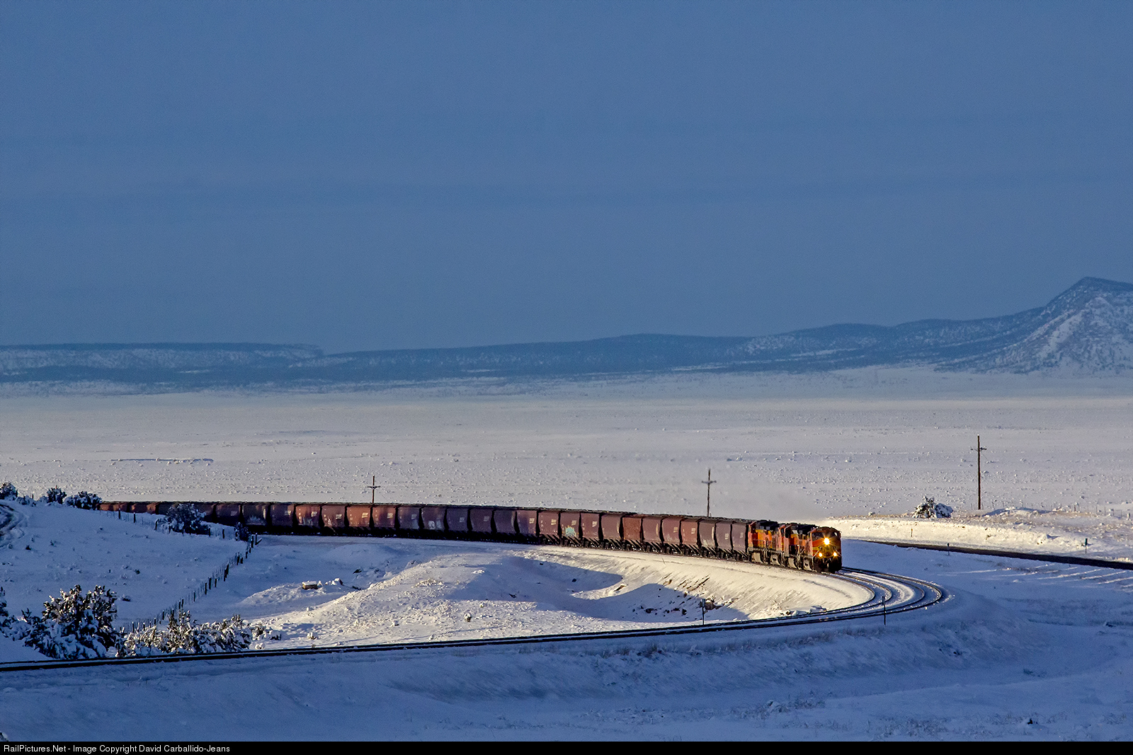 | Two days after the holiday snow storm, the Pica Flat region is still a frozen wonderland as the mercury reads 28 degrees. Here, an empty grain shuttle rumbles around the curve of Audley as it was third train of four eastbounds getting fleeted through the area as M.o.W crews work on a broken rail on main track 1. |