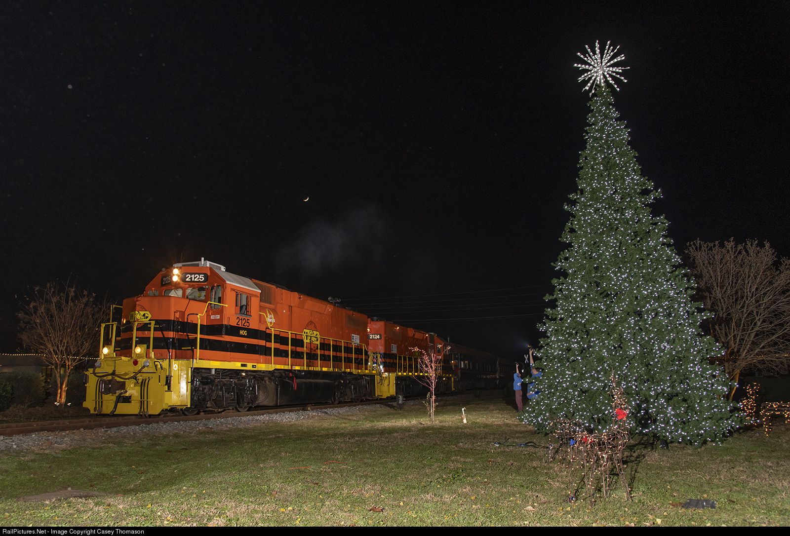 | After attending the annual Christmas parade and tree-lighting party in Plains, Heart of Georgia Railroad GP38-2 2125 leads the SAM Shortline excursion train east out of town. |