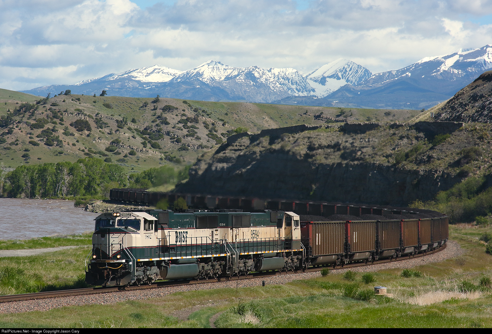 Grinstien SD70macs lead a westbound PGEX coal load along the banks of the Yellowstone River. The mountains in the backdrop is the Beartooth Range that borders the northern side of Yellowstone National Park. The train is full of Powder River coal heading for the Pacific Gas Electrics's Boardman, Oregon Electric Generating Plant.