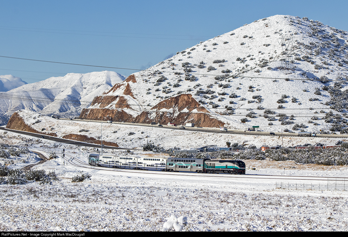 Metrolink 212 approaches the crossovers at CP-Quartz as the train parallels the 14 Freeway with snow providing a nice backdrop.