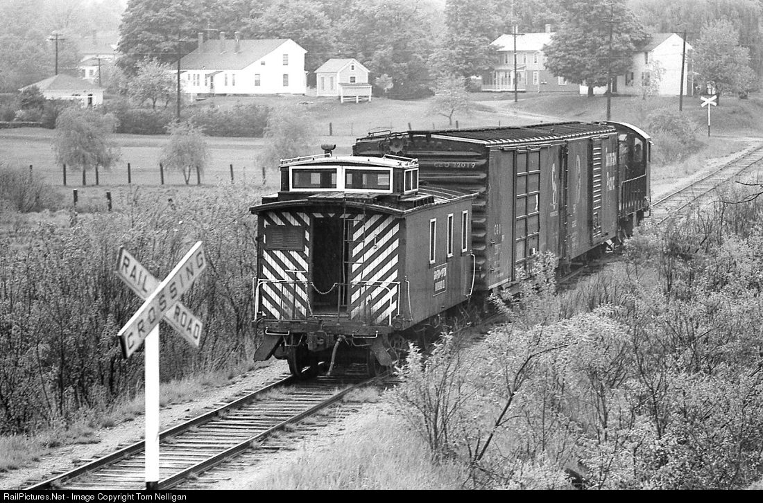 On a rainy spring morning, the Grafton & Upton's daily freight between Hopedale and North Grafton makes its way through West Upton, MA, behind Alco S4 1001. Unlike many small shortlines at the time, the G&U applied the formality of a caboose to its trains.