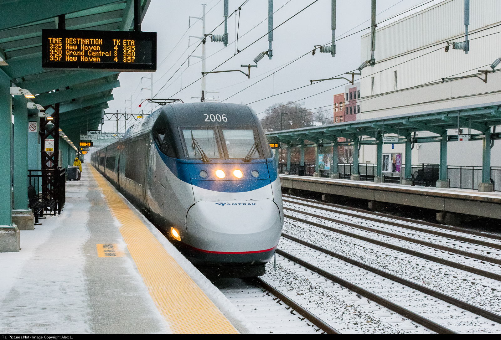 Amtrak Acela #2006 flies through the Fairfield Metro train sation during the start of a snow storm on it's way to Boston.