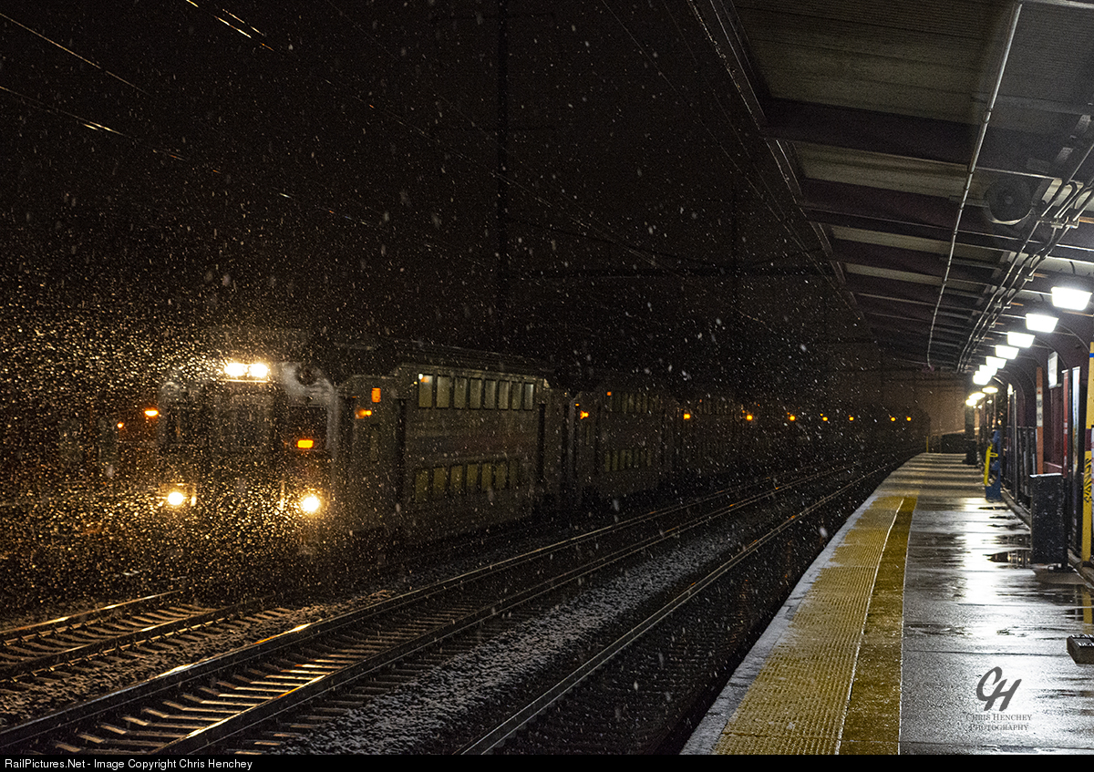 On a snowy evening in New Jersey, an outbound Trenton Express rolls through New Brunswick cab car first at a clip well below track speed. The storm system is likely causing plenty of issues closer to New York, but it's only a mere nuisance here in New Brunswick leading to low accumulation totals.