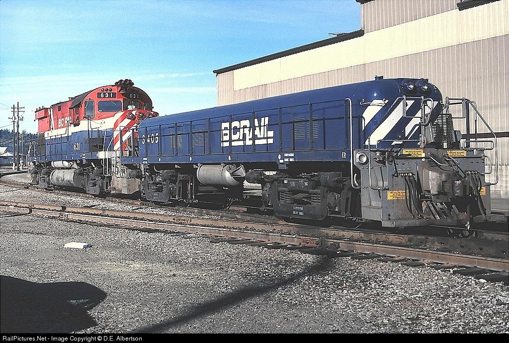 | BCR 631, ex L&HR, and slug S405 working North Vancouver yard. 02OCT89 |