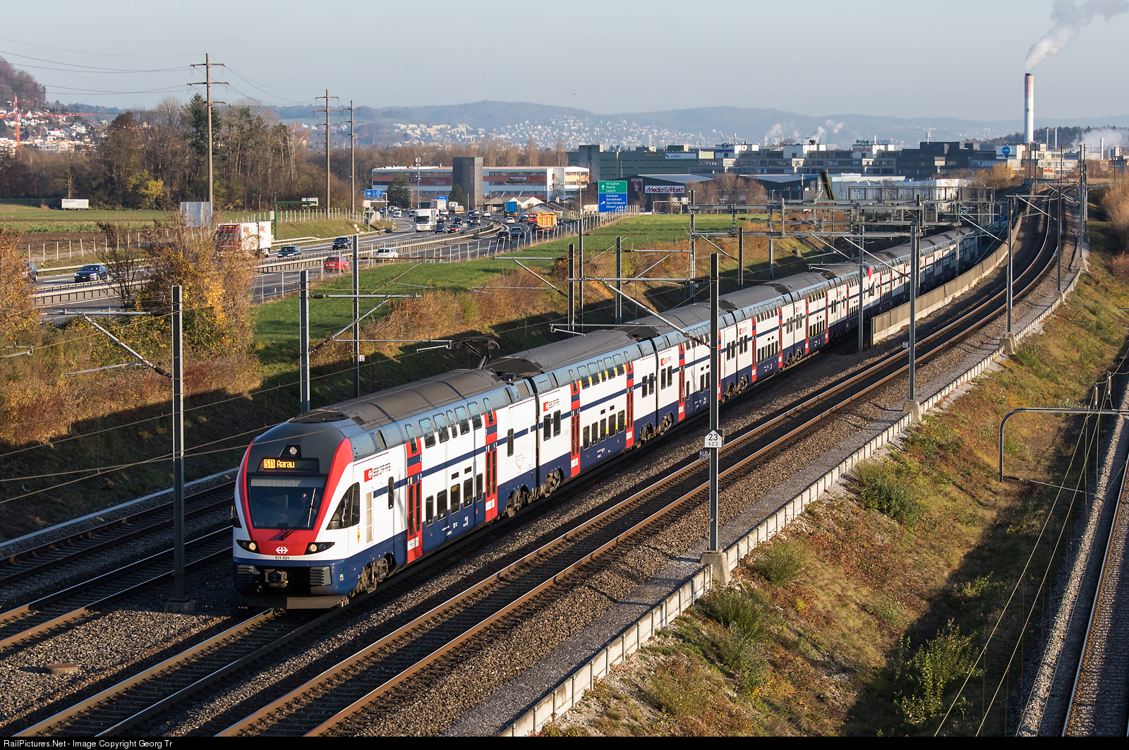 | Doubledeck commuter trains "KISS" of StadlerRail or Regio-Dosto (RVD) RABe 511 # 031 and # 035 of the SBB are running the S 11 service 19156 from Seuzach via Winterthur-Zürich to Aarau, between Dietikon and Killwangen-Spreitenbach. This formation has 1070 seats (240 first class and 830 second class) and can transport up to 2746 persons including standees. |