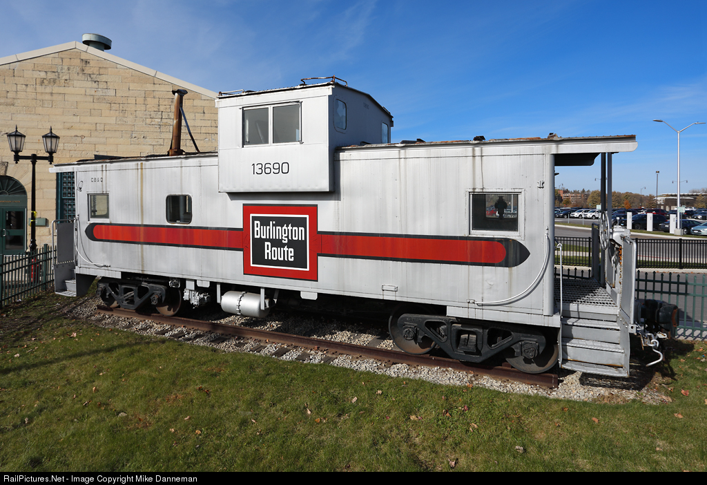 Interestingly, this wide-vision caboose is a former Great Northern car, but it is nicely painted in Chicago, Burlington & Quincy’s red stripe over silver scheme. The caboose sits just outside the Aurora Transportation Center and alongside the Metra platform at Aurora, Illinois, as seen on November 8, 2019. The ATC is right behind the caboose, and is an old shop building that survives (along with one of the roundhouses) from the expansive CB&Q shop facilities that once existed at this location.