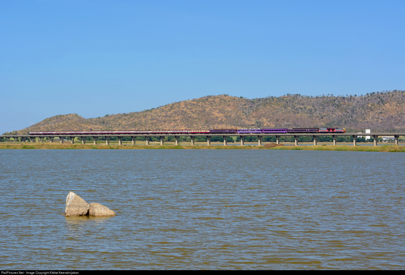 | Japanese-built Hitachi 8FA-36C No.4501, with excursion train from Khok Salung to Kaeng Sue Ten, while crossing a viaduct at Pa Sak Jolasid Dam. |