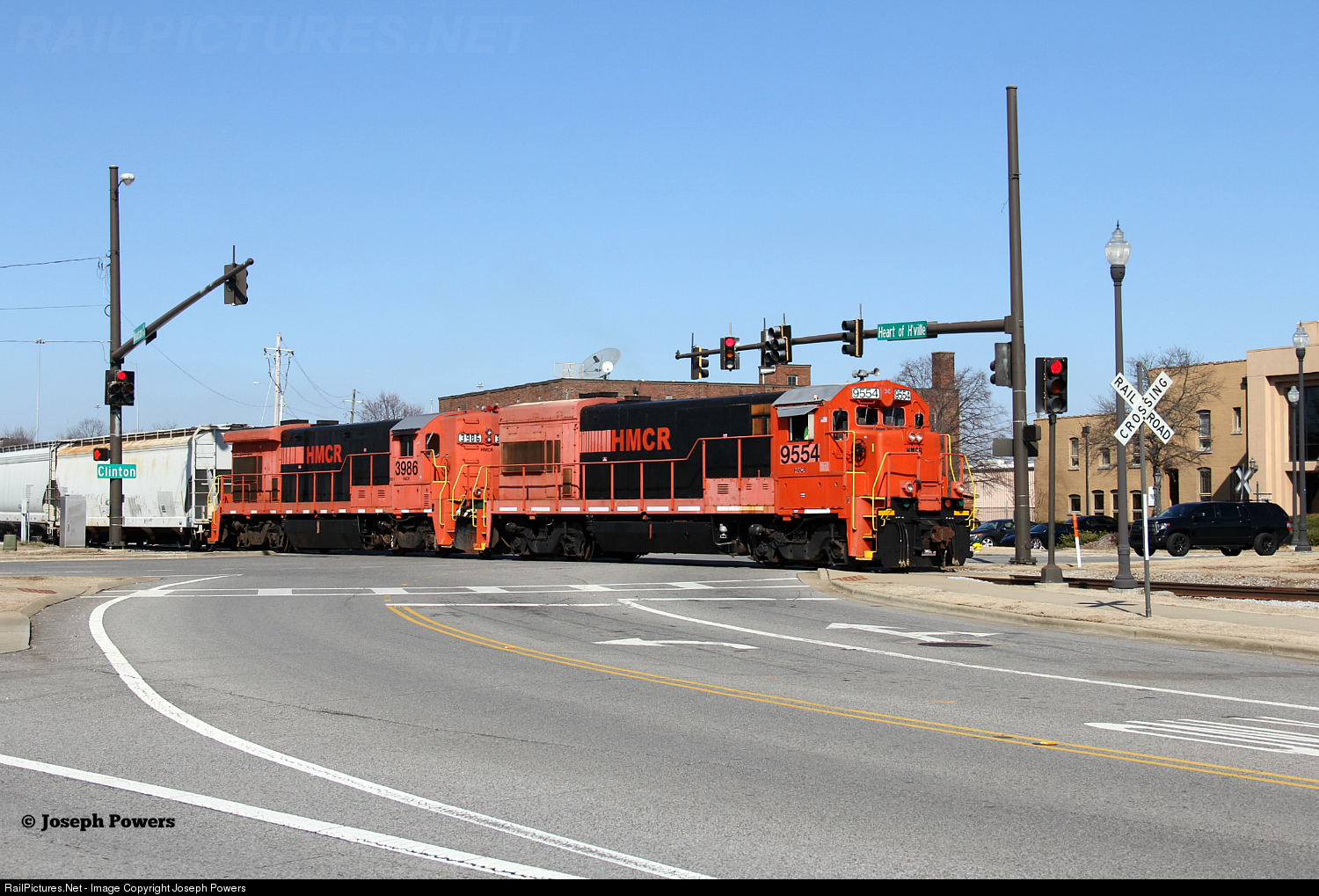 Huntsville and Madison County Railroad Authority U23B 9554 and B23-7 3986 cross Clinton Avenue in downtown Huntsville, Alabama while switching cars in the railroad's yard.