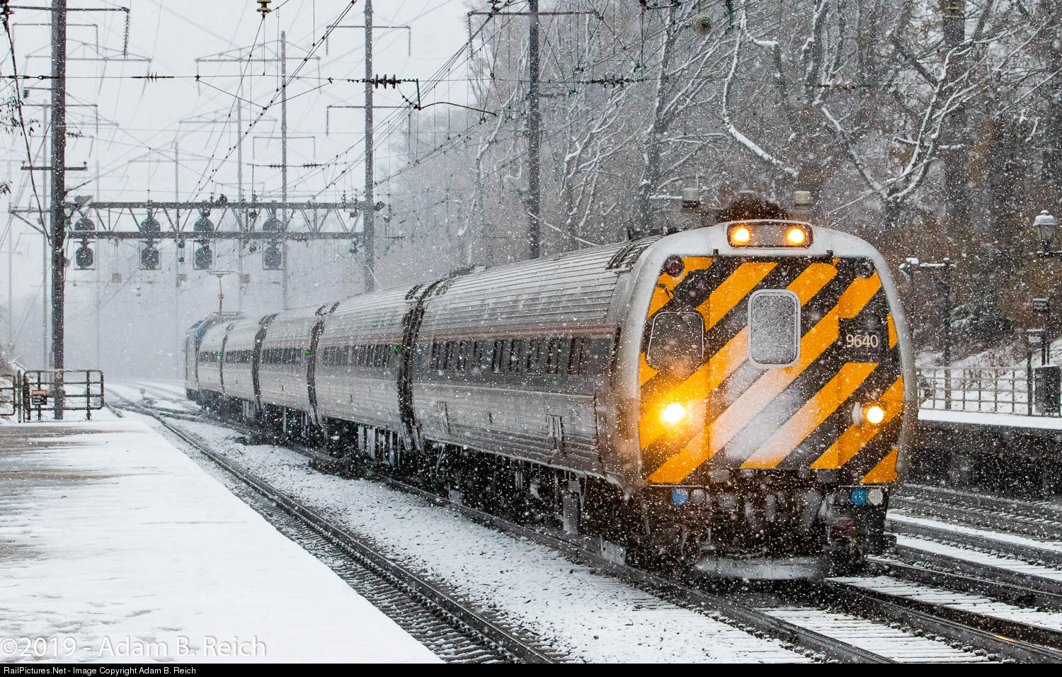 Train #649 passes NJ Transit's Metuchen Station with snow accumulating on ex-Metroliner Cab Car #9640 on Monday, December 2, 2019.