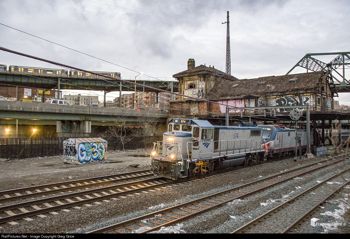 Amtrak Extra 574 tows Regionals 171(5) and 93(5) west past the abandoned NYW&B Westchester Ave Station on Amtrak's Hell Gate Line in the Bronx. An explosion at one of the line's substations located next to Con Edison's Van Nest facility caused power on the line to be shut down forcing Amtrak to summon it's nearby diesel work engine fleet for emergency tow service. The diesels shuttled Regionals between Manor Interlocking (Pelham Manor) and Gate Interlocking (Queens). Acela trainsets were turned before reaching the outage area. |