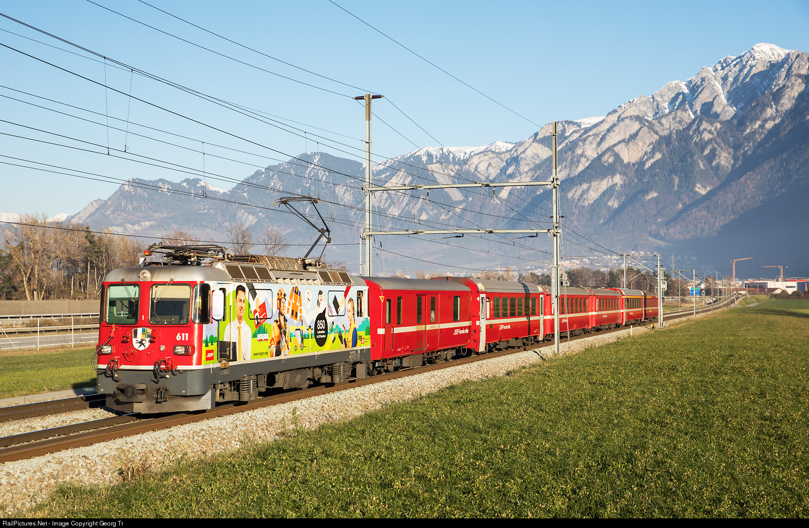 | Ge 4/4 II # 611 "Landquart" of the Rhaetian Railway was the first of this very successful series, built in 1973 by SLM and BBC with phase angel control. The locomotive with a publicity paint scheme for Login (Vocational training in the world of transport) is pulling the Regio Express 1240 Scuol-Tarasp-Landquart, then changing number to RE 1749 further on to Chur-Ilanz-Disentis, between Chur and Felsberg. |
