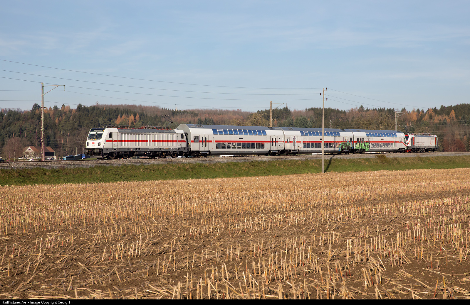 | Test train of the Deutsche Bahn with Bombardier locomotive TRAXX P160 AC3 147 # 558, three doubledeck IC2 cars (including a cab car DBpbzfa 668.4) and Bombardier TRAXX F140 MS3 188 # 006 in the rear, between Dättwil and Mellingen. The train circulated several times between Wettingen/ Baden Oberstadt and Mellingen for measurement of magnetic field and parasitic currents. Locomotives 147 of the Deutsche Bahn with doubledeck IC2 cars should run as push-pull trains between Stuttgart and Zürich every hour, but the project is delayed for several years and promised for decembre 2020 now. |
