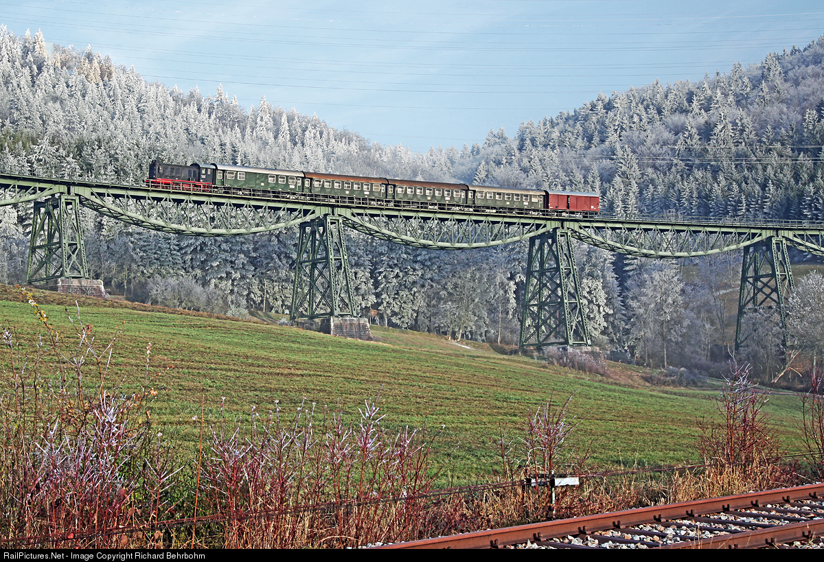 | After long hours with fog today, a little bit of sun was shining, when an empty train is crossing the Biesenbachviaduct on the Sauschwänzlebahn for Santa Claus train rides in the evening. |