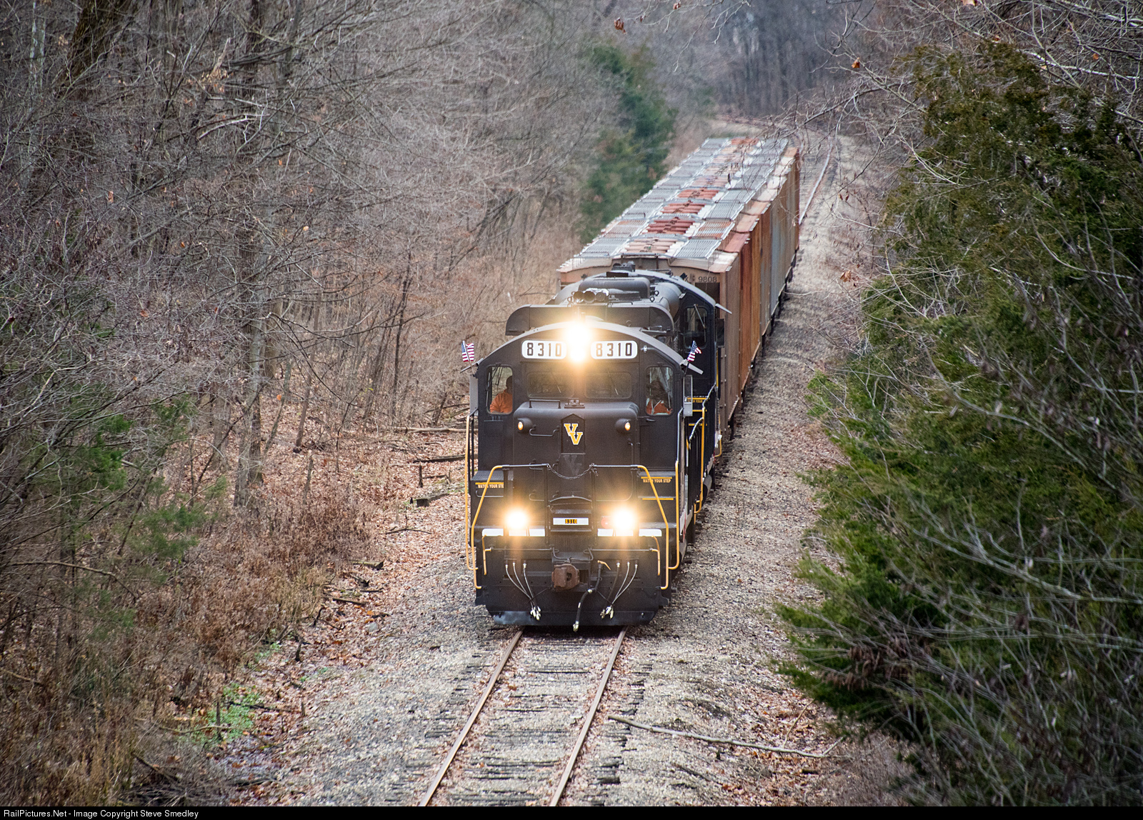 With 8 sand hoppers for storage in tow, Vermilion Valley Railroad's 8310 drops down into the Wabash River Valley between Foster and Olin, Indiana. Steve Smedley photo