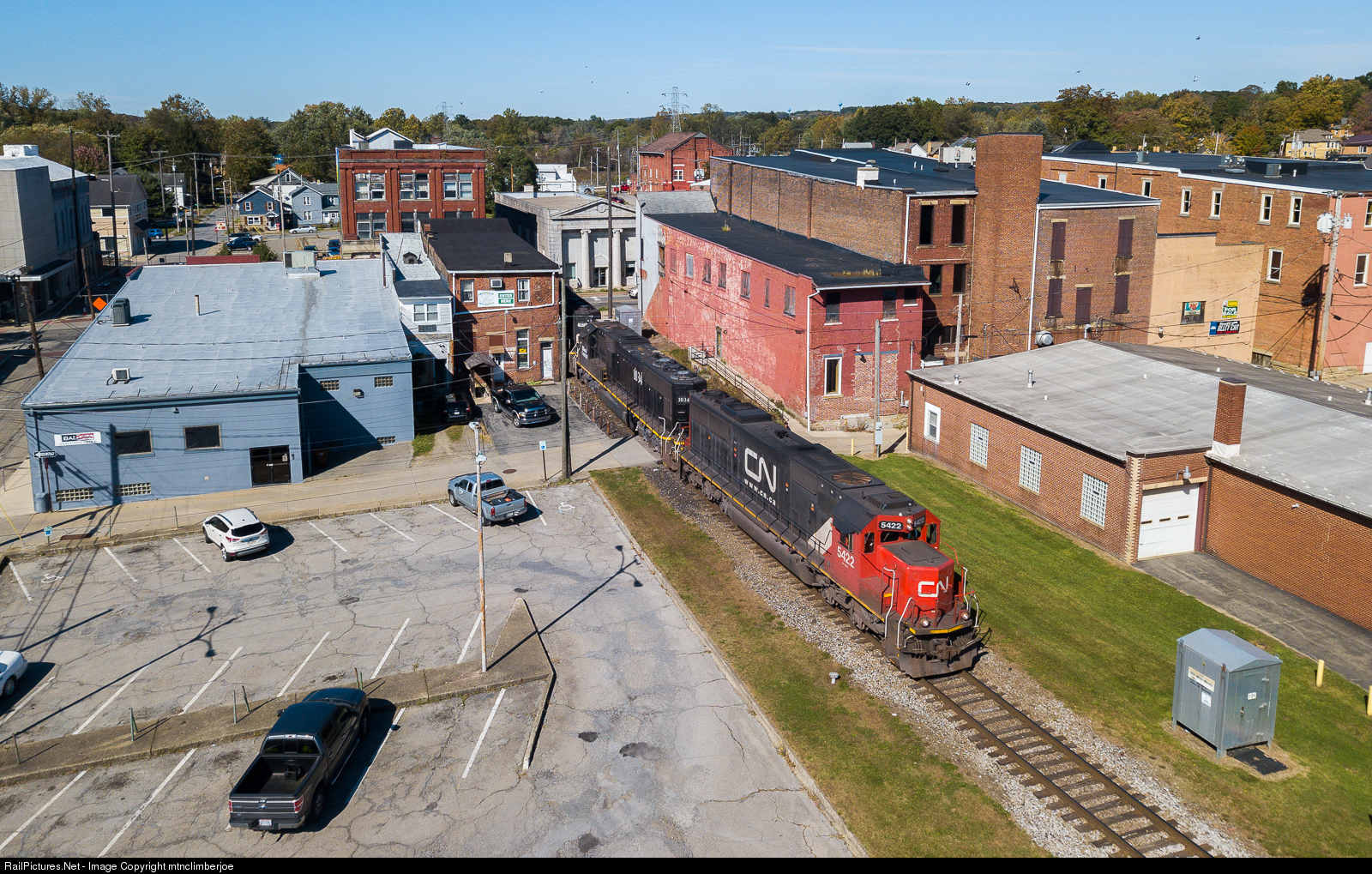 | Passing through the heart of downtown Greenville, Pennsylvania, a set of light power on the CN Bessemer Sub heads towards the shops. The crew took ore empties up to Conneaut in the morning and switched cars at the docks, but returned south light |