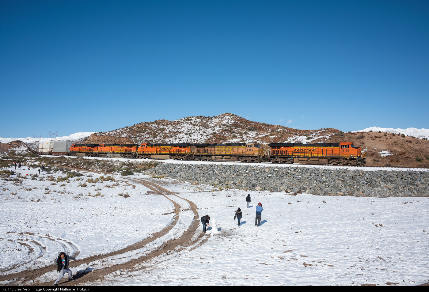 | Snowball Fight! - A hotshot intermodal bound for Commerce traverses down a snow covered Cajon Pass as a boy prepares to launch a snowball at the unstoppable giant. Unfortunately, his handmade ball of ice will only fall a considerable distance short of his intended target. |
