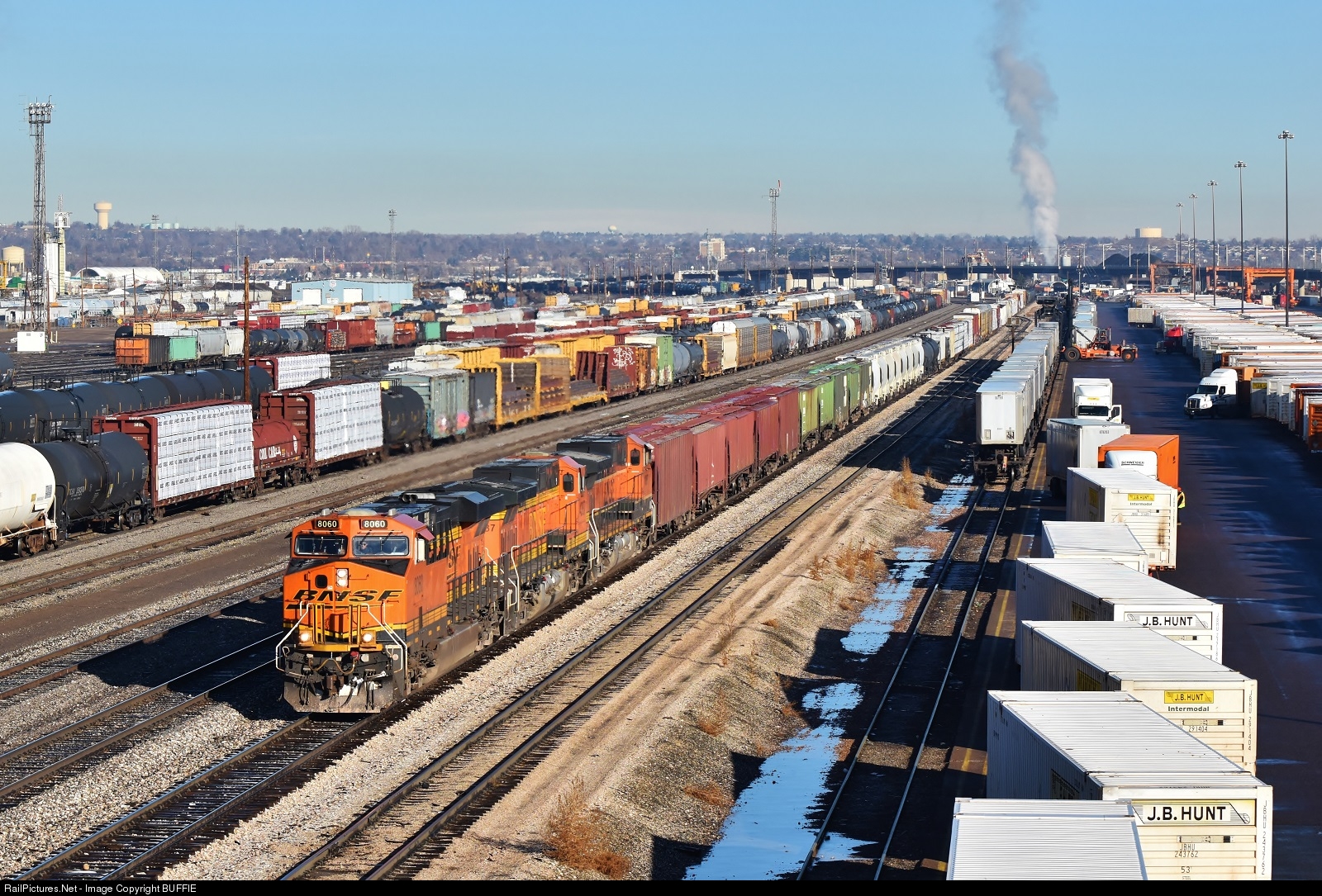 BNSF 8060 (ES44C4) runs between the UP North Yard (on the left) and the BNSF intermodal facility as it heads towards the Denver Yard downtown.