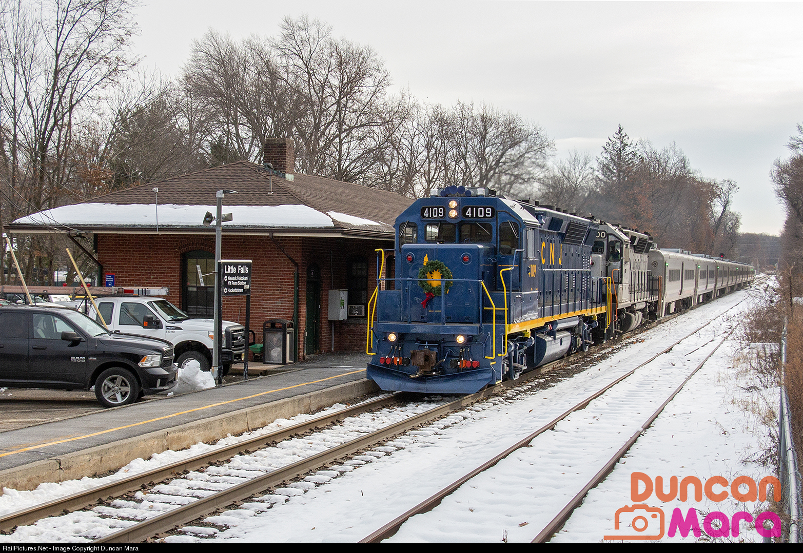 | NJ Transit's Railmen for Children train passes the Little Falls NJ Transit Station on the Montclair-Boonton Line with the CNJ tribute unit #4109 and #4100 leading the trip to Port Morris. The RFC train operates annually in December to give special needs and less fortunate children a train ride where they get to meet Santa Claus and receive gifts. |