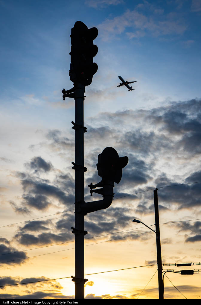 One of the hundreds of flights taking off from Atlanta's Hartsfield-Jackson International Airport passes over the signals at Mountain View on Norfolk Southern's ex CofG Macon - Atlanta route.