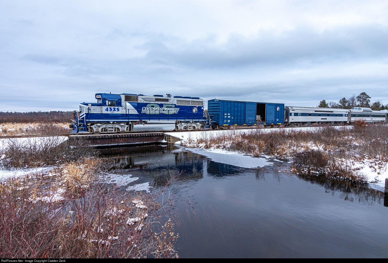 | This is one of the first pictures my new 10-22mm has taken. LSRC 4325 is still a few miles outside of Roscommon, but wasting no time crossing the fairly clear creek with the Toys For Tots train in tow. |