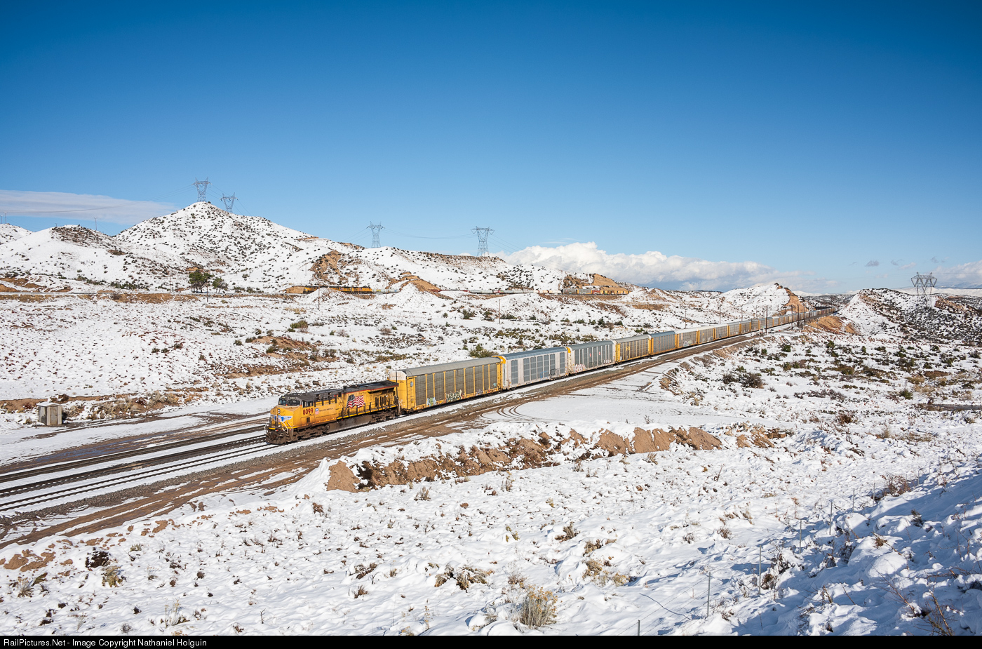 | Winter Wonderland on Cajon - A southbound UP Auto train starts descending upon the snow covered Cajon Pass with another UP manifest off in the background holding the siding for another manifest to clear the main ahead. |