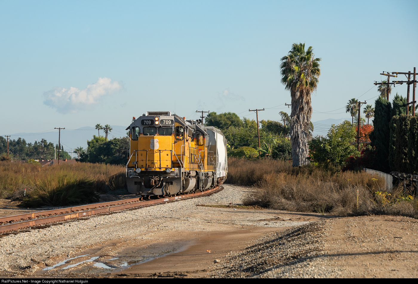 | The Fullerton Switcher returns from Brea after dropping off loads and picking up empty hoppers. Older power leads the small train around the curve that comes out of La Habra, back into Whittier near the 1st Avenue grade crossing. |
