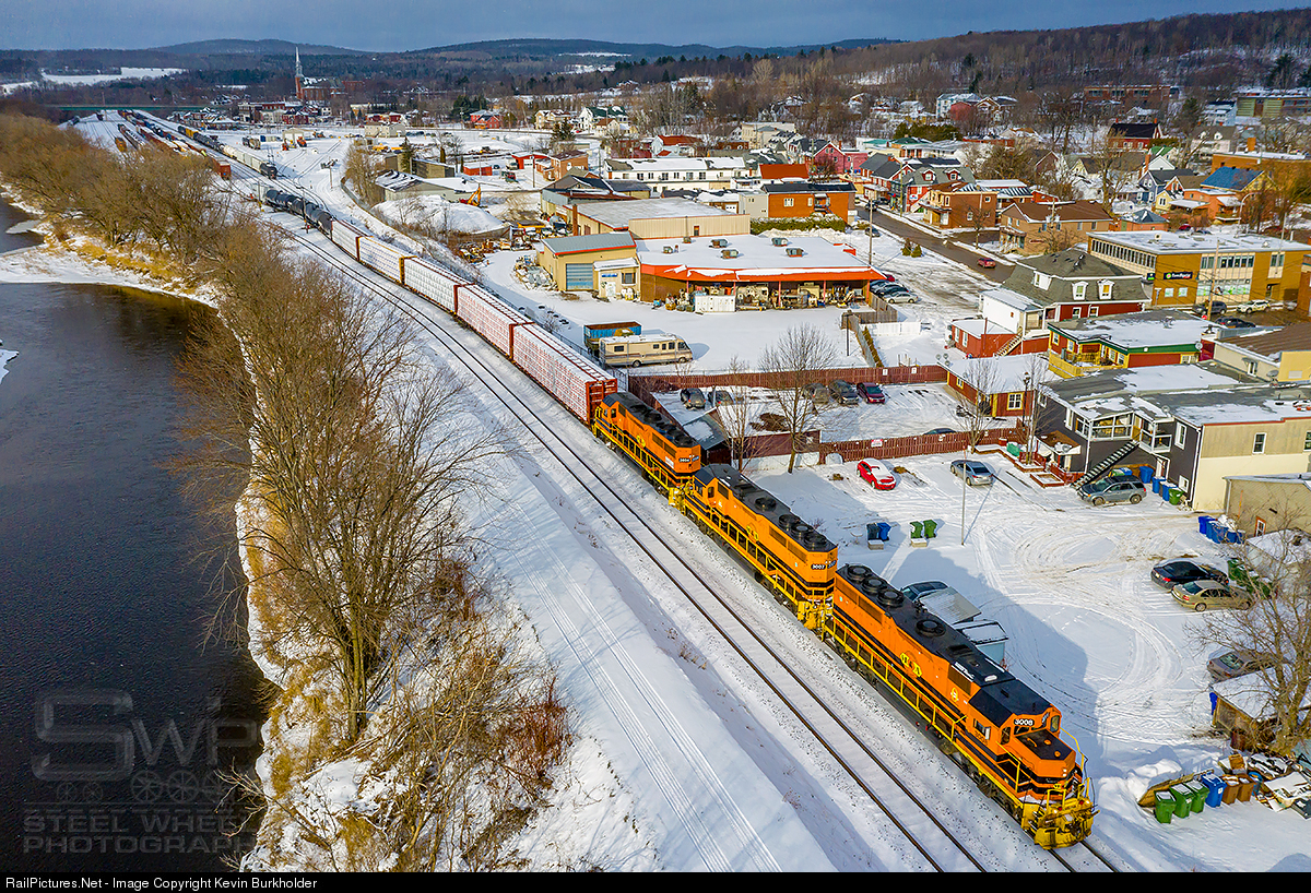 The St. Lawrence & Atlantic Railway's 509 local crew is putting together road train 394-06, set to depart later in the afternoon from Richmond, Quebec, to Lewiston Jct., Maine, with GP40-2 trio, 3008, 3007, and 3004. The train is seen at Richmond, QC on the south end of the yard doubling in preparation for the road train departure.