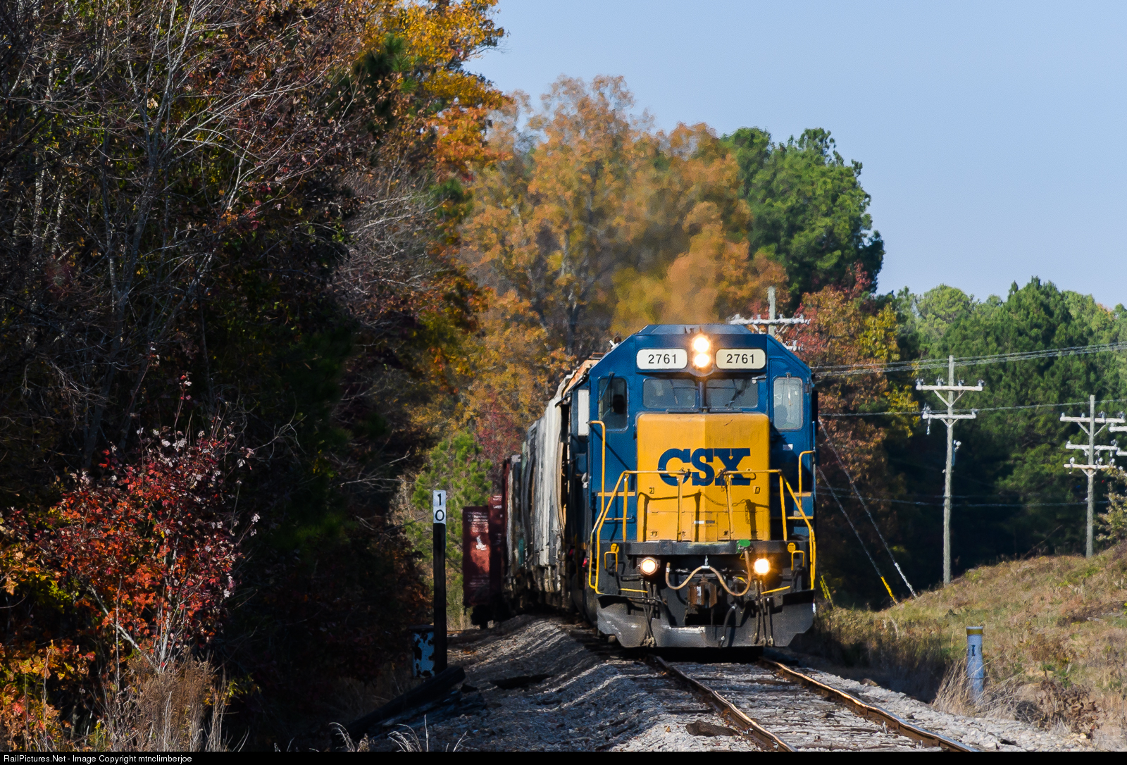 | The CSX Apex to Durham local is making its return trip to Apex with a pair of GP38-2's. The train passing milepost 10 on the former Durham & Southern as fall colors emerge in the surrounding woods of Genlee, North Carolina. |