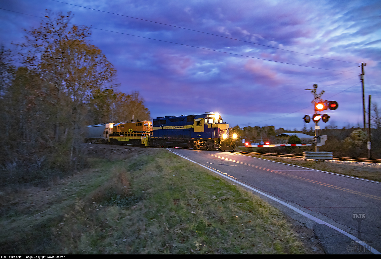| The Heart of Georgia's Cordele Turn is just a couple miles outside of downtown Americus, Georgia early on the morning of December 11, 2019 as seen in this pan shot during twilight. HOG GP38-2 2038, a former N&W/NS GP35 now owned by GWI is the only unit surviving in HOG's blue and yellow livery. |