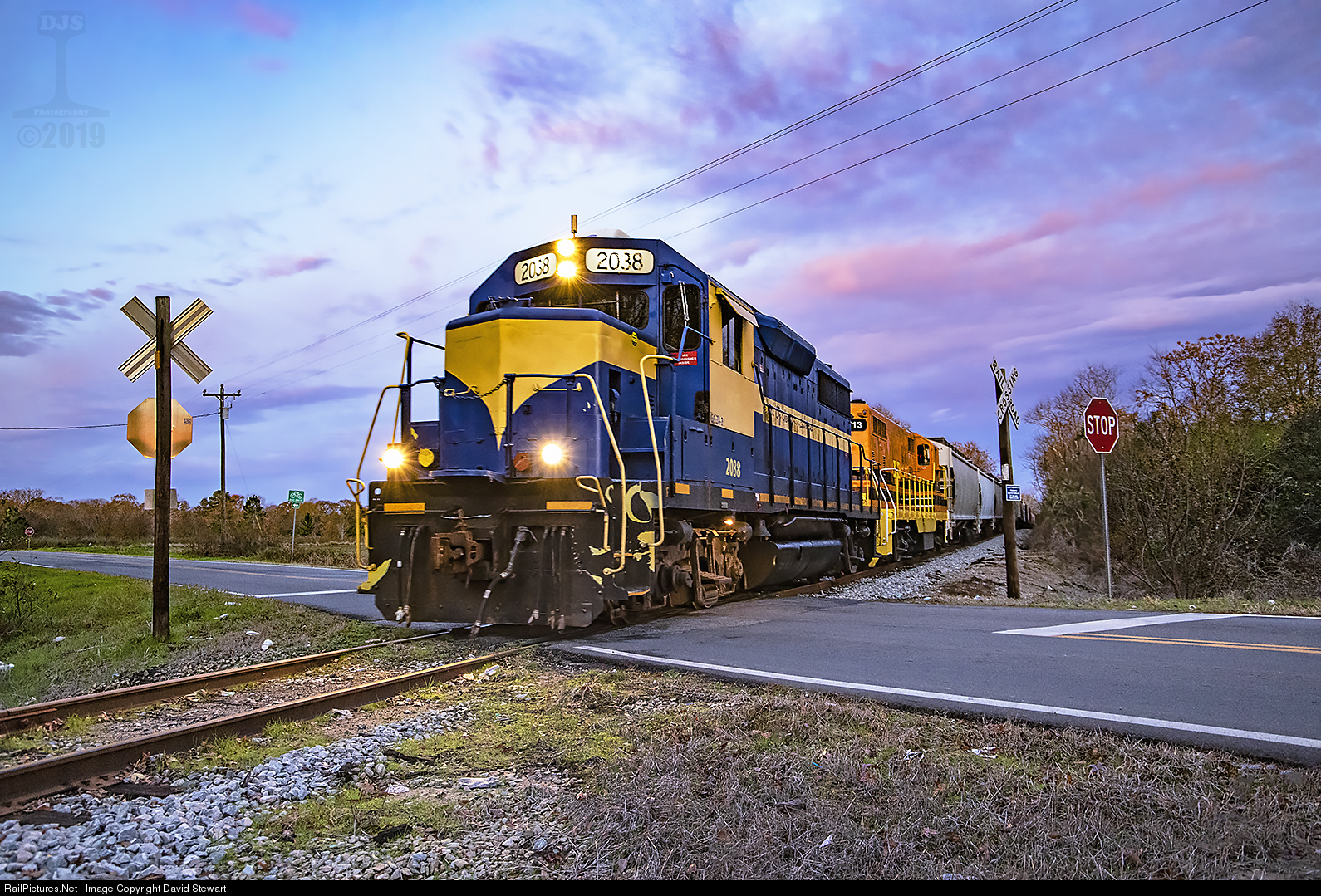 The Heart of Georgia's Cordele Turn is several miles east of Americus, Georgia early on the morning of December 11, 2019. HOG GP38-2 2038, a former N&W/NS GP35 now owned by GWI is the only unit surviving in HOG's blue and yellow livery.