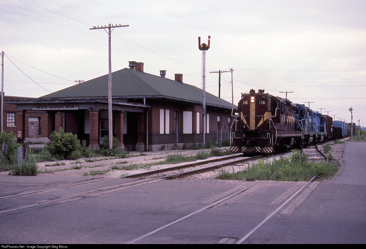 DMIR 156 leads an E&LS freight past the ex-Milwaukee Road depot in Iron Mountain, MI in June of 1987.