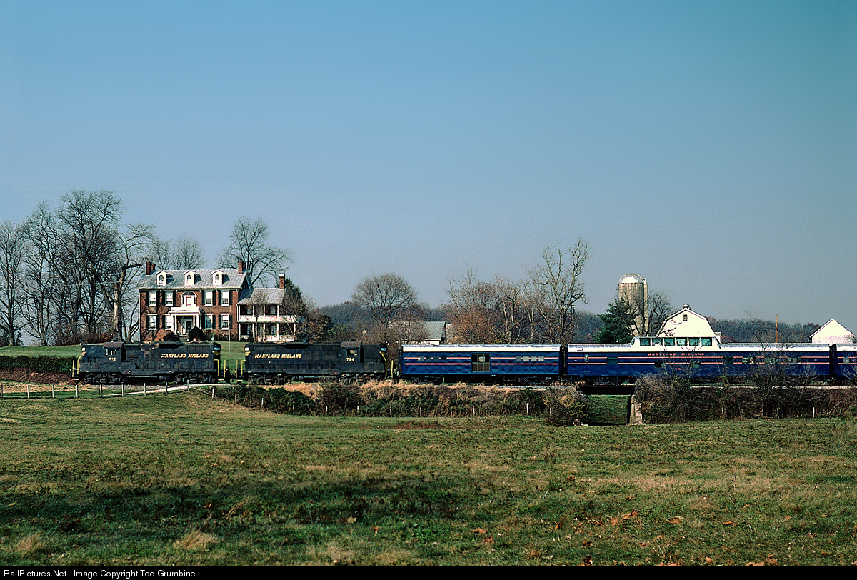 “Blue Debut” Debuting Maryland Midland Railway’s dark blue and orange paint scheme for its passenger equipment, MMID 812 and 794 are on the point of a Blue Mountain Limited excursion, just after departing Union Bridge for Highfield on 11/07/1987.