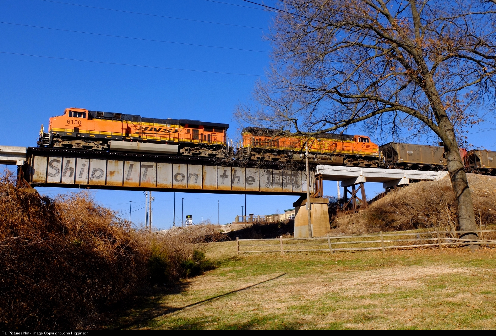 A southbound loaded coal train has just departed Lindenwood Yard on the western fringes of St. Louis as it crosses the bridge over Watson Road (formerly US Route 66), which still bears the "Ship It on the Frisco" slogan.