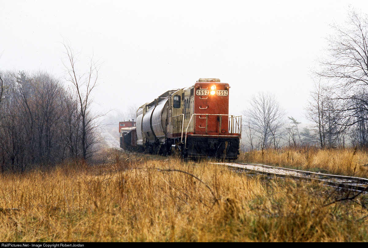 | GREENWOOD BRANCH local pulls through a sag on its way to Loyal. The line mostly straight but not flat originally started as a cutoff to reduce the mileage between the Twin Cities and Stevens Point but never made it past Greenwood where it connected with the Fairchild and North-Eastern which passed through Willard where I was born. Terry Norton Photo. |