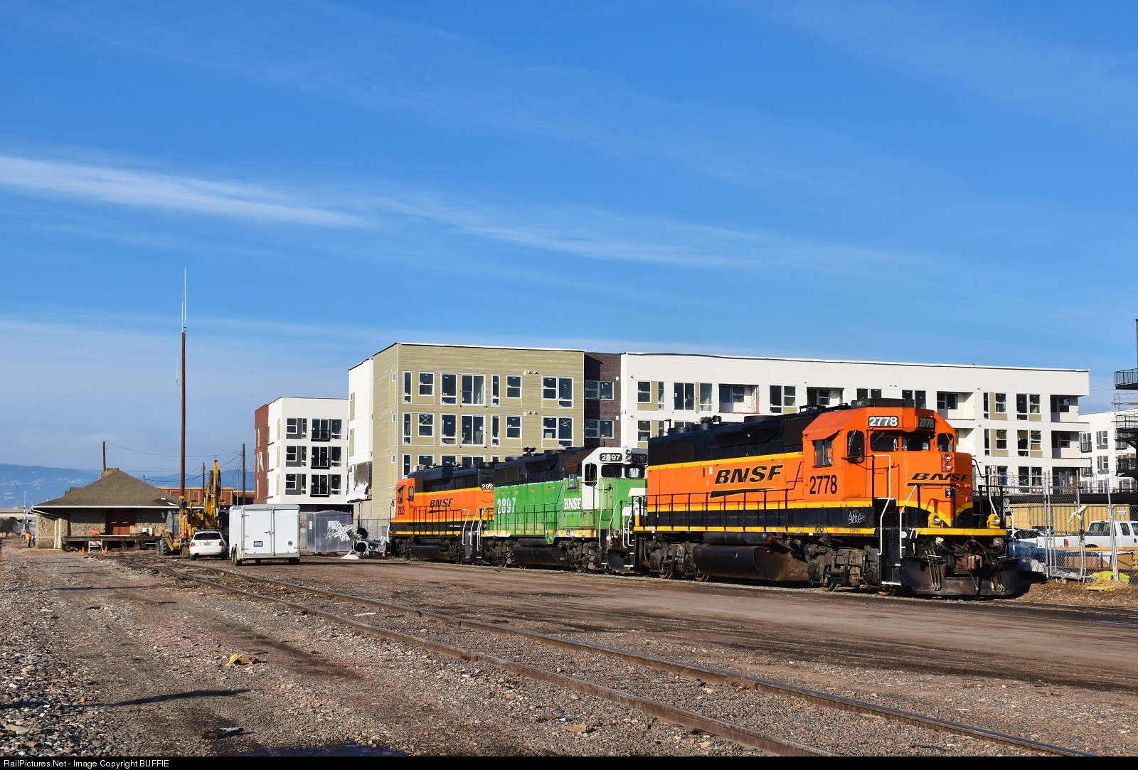 | A trio of BNSF Geeps hold station at the Longmont Depot. For those familiar with Longmont you will notice that the old Butterball turkey processing plant has been demolished and new apartments are now being constructed. Off to the left is the historic Longmont Depot and if you search the data base you will be able to appreciate the transformation of this area of town. |