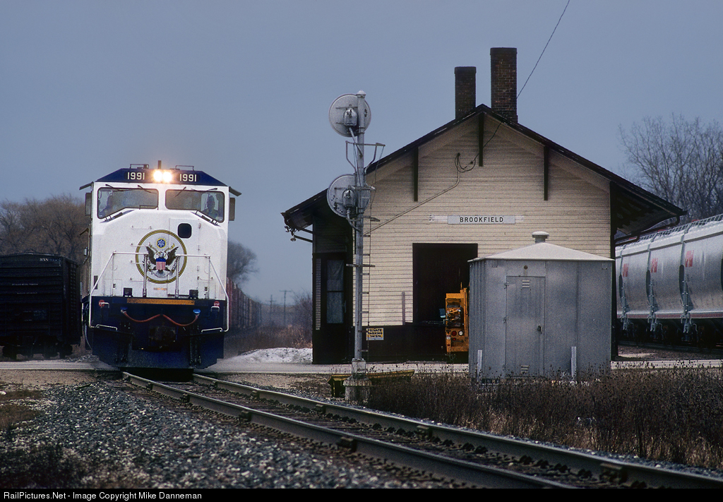 On a dark and gray, cold and snowless January 15, 1995, Burlington Northern No. 1991 leads Soo Line hotshot train 425 past the Brookfield, Wisconsin, depot, as a grain train flies by on the eastbound main. A large seal of the United States graces the mostly white front of the locomotive specially-painted EMD SD60M to honor U.S. troops serving in Operation Desert Storm in the Gulf War.