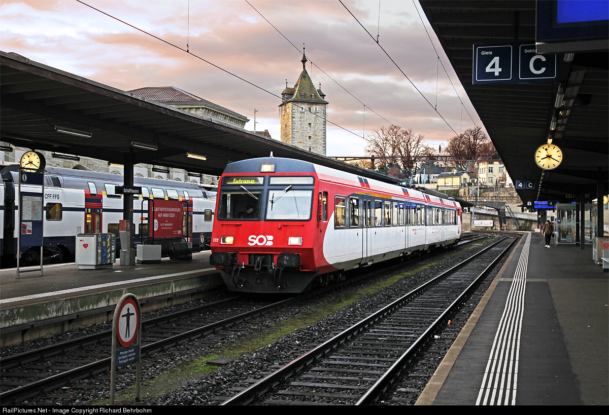 | In the early morning, a short push-pull train (built in 1982) of the Südostbahn makes a stop in Schaffhausen. It is on a farewell ride. Since today, with the new timetable, these trains are no longer in use. |
