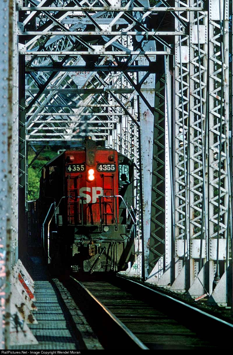 | The westbound Whiteson Flyer crosses the Willamette River on the Tillamook Branch. Although lead unit SP 4355 was retired a few months later, it lives on today as an industrial switcher at a waste transfer facility in Utah. |