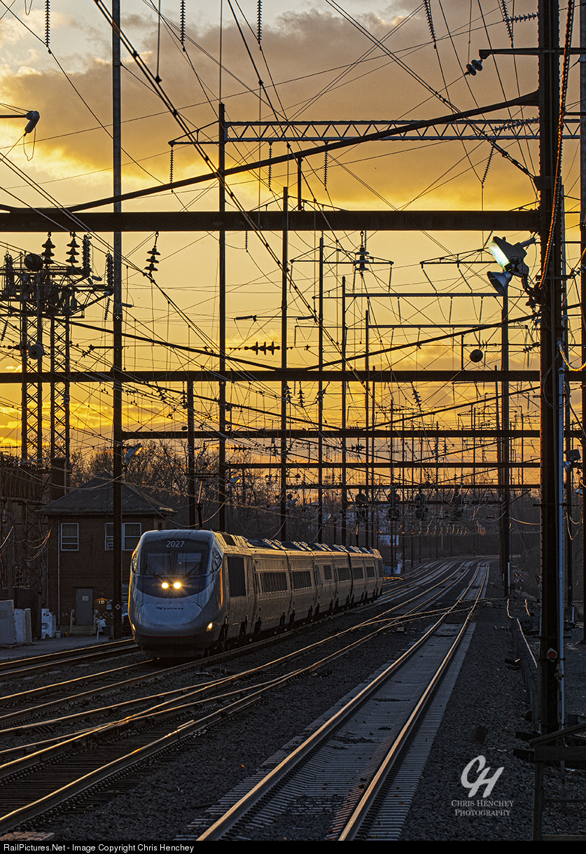 | A Boston-bound Acela Express shoots through Metuchen, under the backdrop of a pleasant, albeit cold and windy, December sunset. |