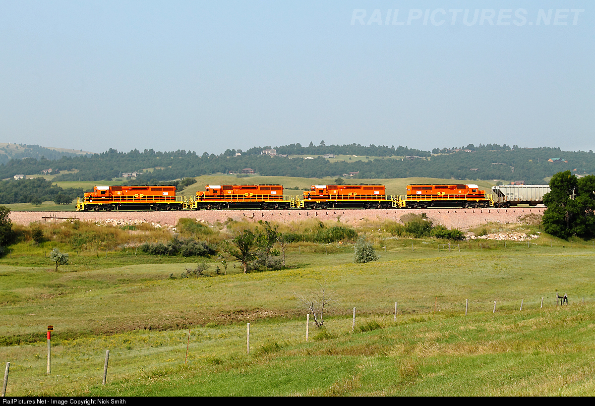 A four pack of RCPE SD40-2's lead the LBFRC into the Black Hills and toward Rapid City under hazy skies created by forest fires out west. Once in Rapid, they will swap the train of bentonite loads for empties and then return to Belle Fourche that evening.