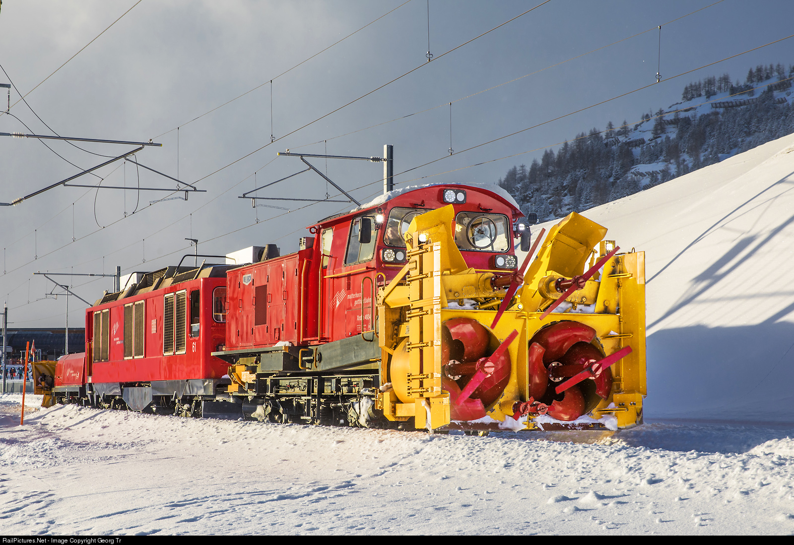 The snow fighting crew of the Matterhorn-Gotthard-Bahn (MGBahn) from Andermatt is on the way to the Oberalppass, in Nätschen station. In the middle of the consist is cogwheel diesellocomotive HGm 4/4 # 61, shoving the diesel snowblower Xrotm # 4934 (built in 1980 by Beilhack), and pulling the "Zaugg" snow plow X # 4903, which was built in 2017 on the frame of former freight car Kkl # 4601 of the Furka-Oberalp-Bahn. The snow blower Xrotm # 4934 has two 335 kW Deutz diesel motors, but is not self propelled. It was built By Beilhack/Rosenheim/Germany and Josef Meyer/Rheinfelden (bogies), for the Furka-Oberalp-Bahn and is of the same type as the Xrotmt # 9217 of the RhB.