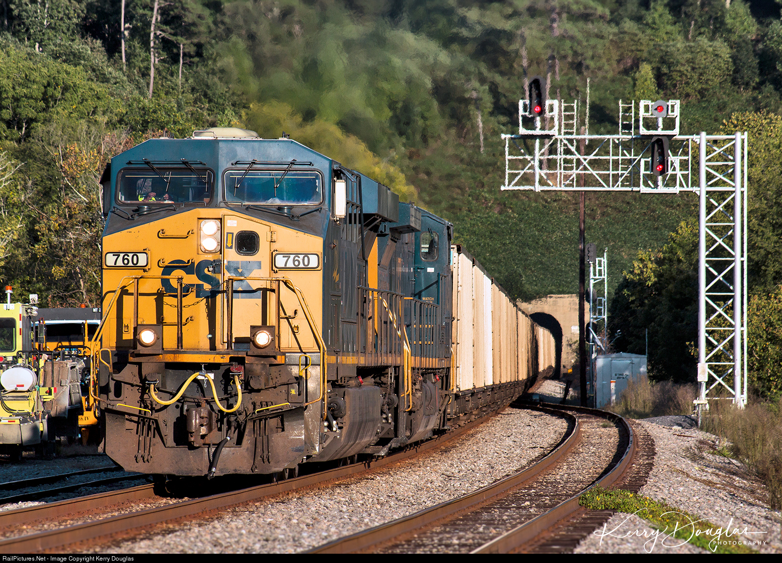 After waiting for 30 minutes the stop signal drop to an approach at the south-end siding of Tunnel Hill, GA (MP WA-106.7 SE Tunnel Hill), and CSX W105-20 (Mobile,AL-Wartrace,TN) snakes it way out of the north portal of the Chetoogeta Mountain Tunnel. The 115 car empty train will run a mile north to the north-end of Tunnel Hill, and wait the main is clear to proceed. W105-20 is a solid string of Gulf Power Co. hoppers that is heading to Wartrace, TN to the Walking Horse & Eastern Railroad for storage, but before the train get to it's destination the cars will wait at Wuahatchie Yard til the Walking Horse is ready to received the storage train.