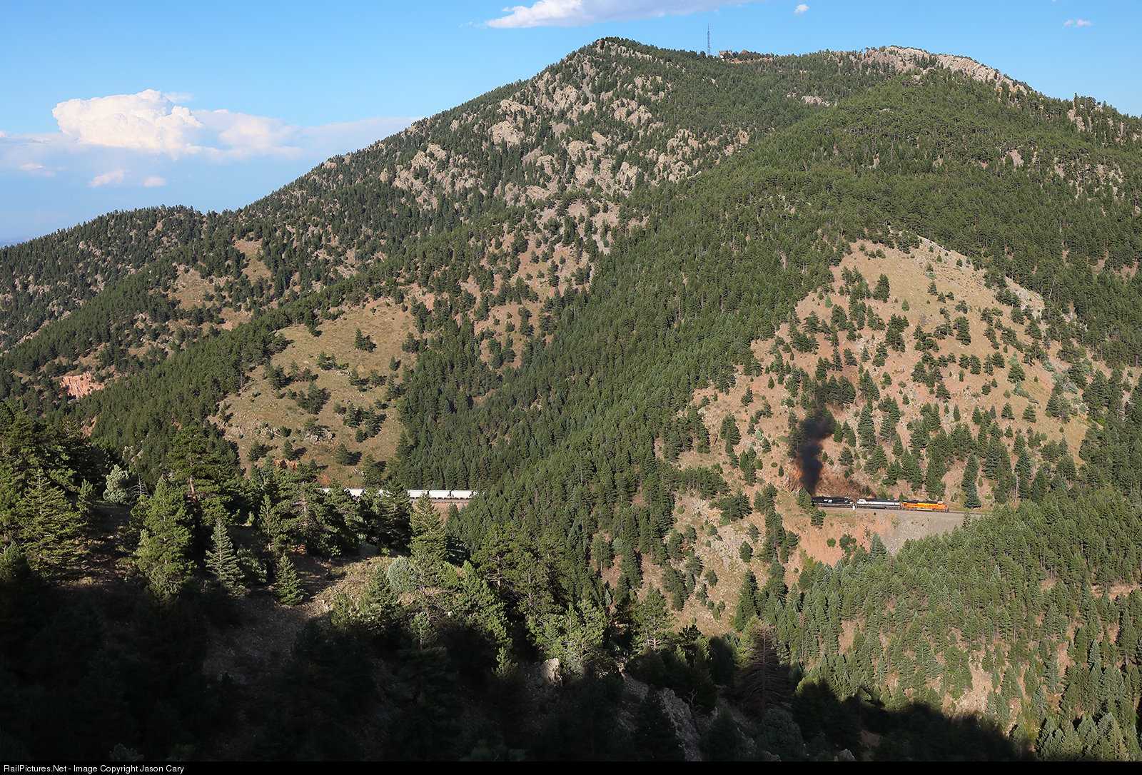 The 200 foot high smoke plume of a westbound sand train exiting Tunnel 15 on the Moffat Road is dwarfed by Eldorado Mountain. The ex. Denver NorthWestern & Pacific "Moffat Road" uses the east, west and north flanks of of the 8344 foot high mountain to gain elevation for the climb towards the Continental Divide. On the far upper left of the photo a large thunderstorm boils in the afternoon heat of the Great Plains.....