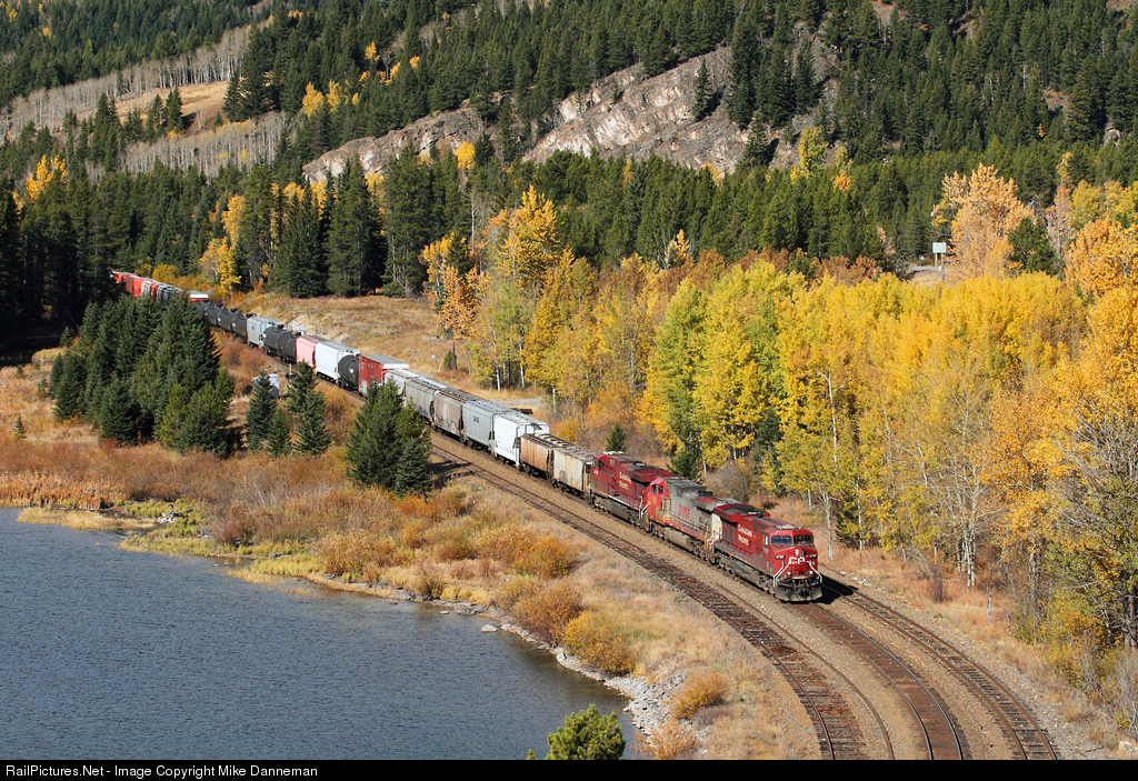Surrounded by the bright colors of autumn is an eastbound Canadian Pacific freight working along the shore of Summit Lake as it climbs the final mile of grade to Crowsnest Pass at Crowsnest, British Columbia, on October 10, 2017. In a few moments, the train will cross the border into Alberta.