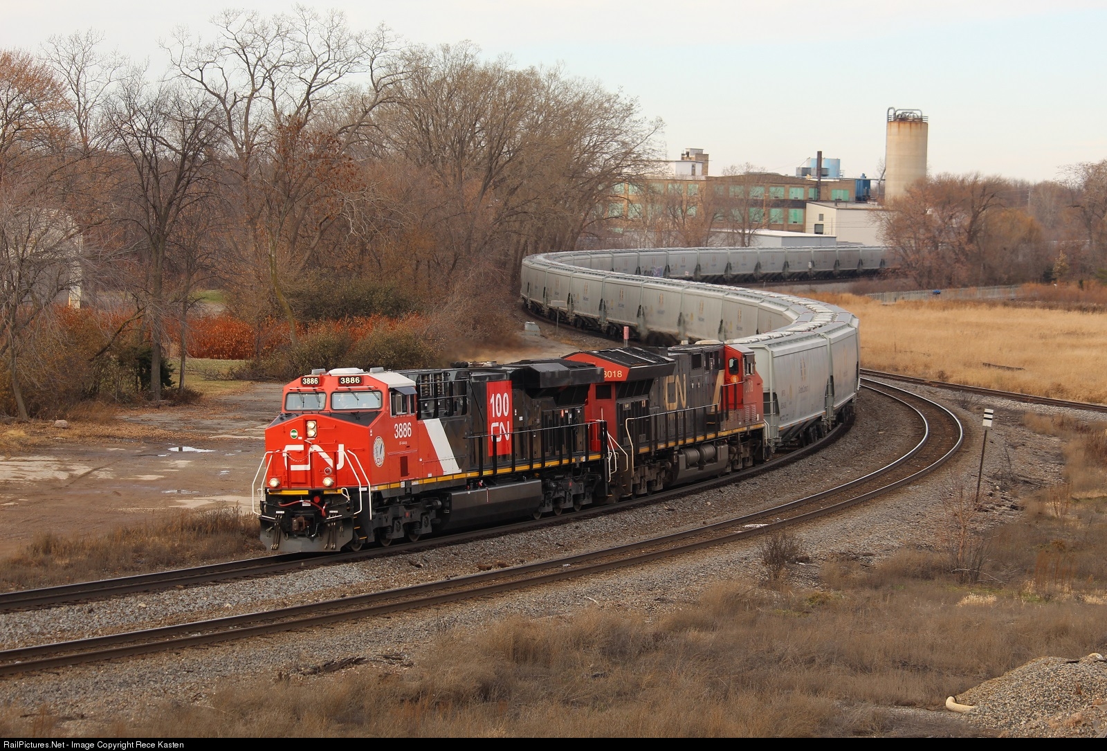 | CN 3886 leads a southbound with a solid set of grain cars through Neenah past the former Soo Line Neenah depot. CN 3886 is one of many ES44AC's that CN received with the 100 sticker to commemorate their 100th anniversary. |
