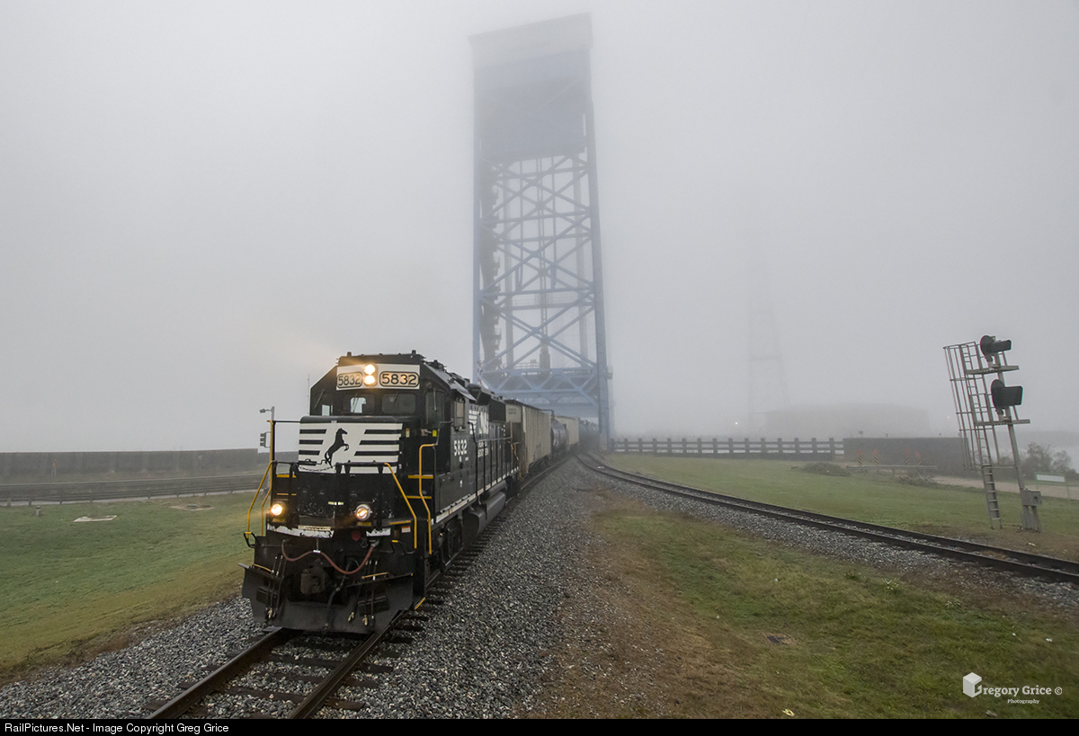 A Norfolk Southern local led by EMD GP38-3 #5832 crosses the Florida Avenue Bridge on the Chalmette Branch in New Orleans during a foggy morning.