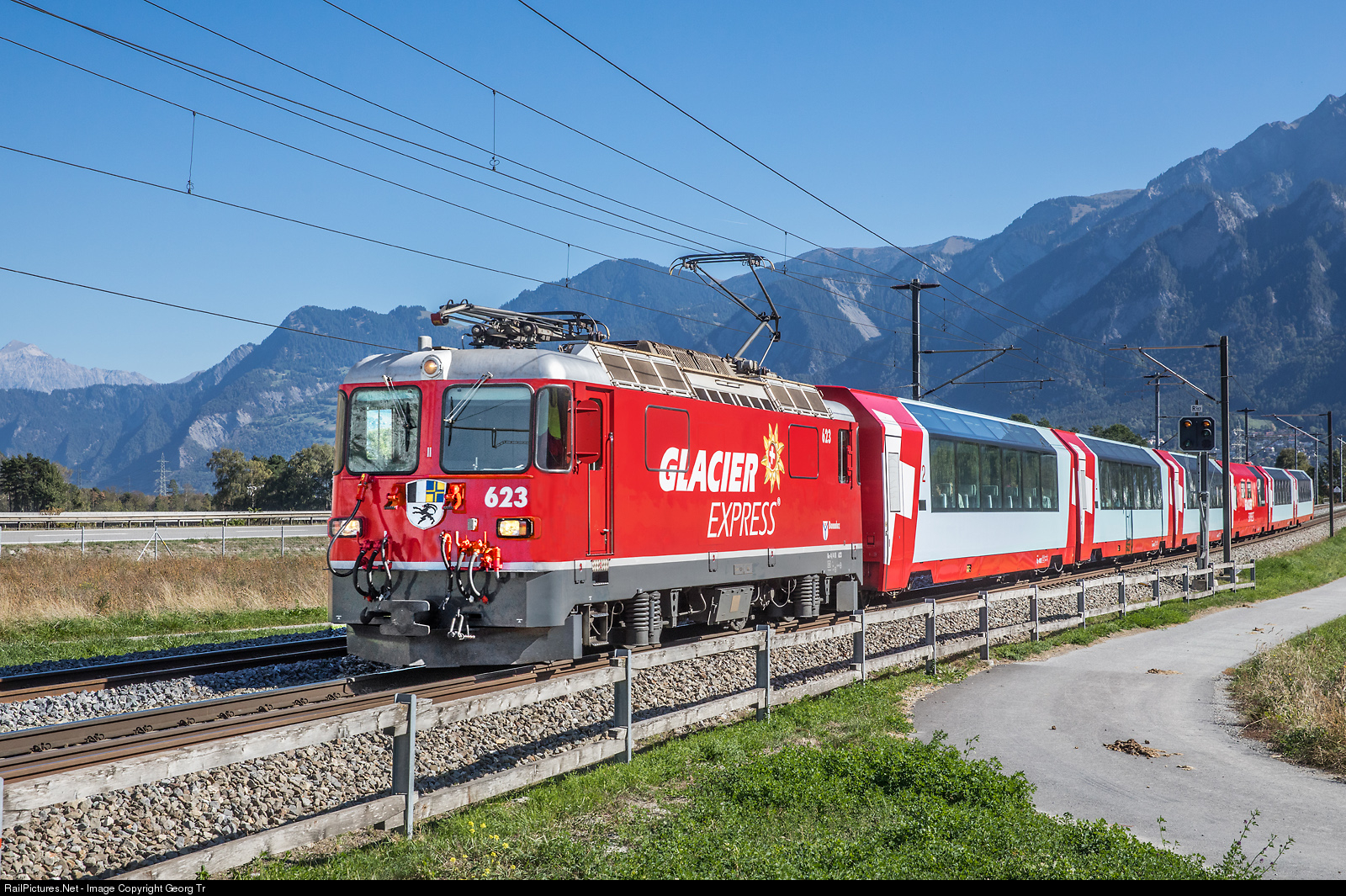 | The Ge 4/4 II # 623 "Bonaduz" in the appropriate Glacier Express paint scheme is pulling the GLACIER EXPRESS GEX 905 from Chur to Disentis (-Andermatt-Brig-Zermatt), between Chur and Felsberg. |