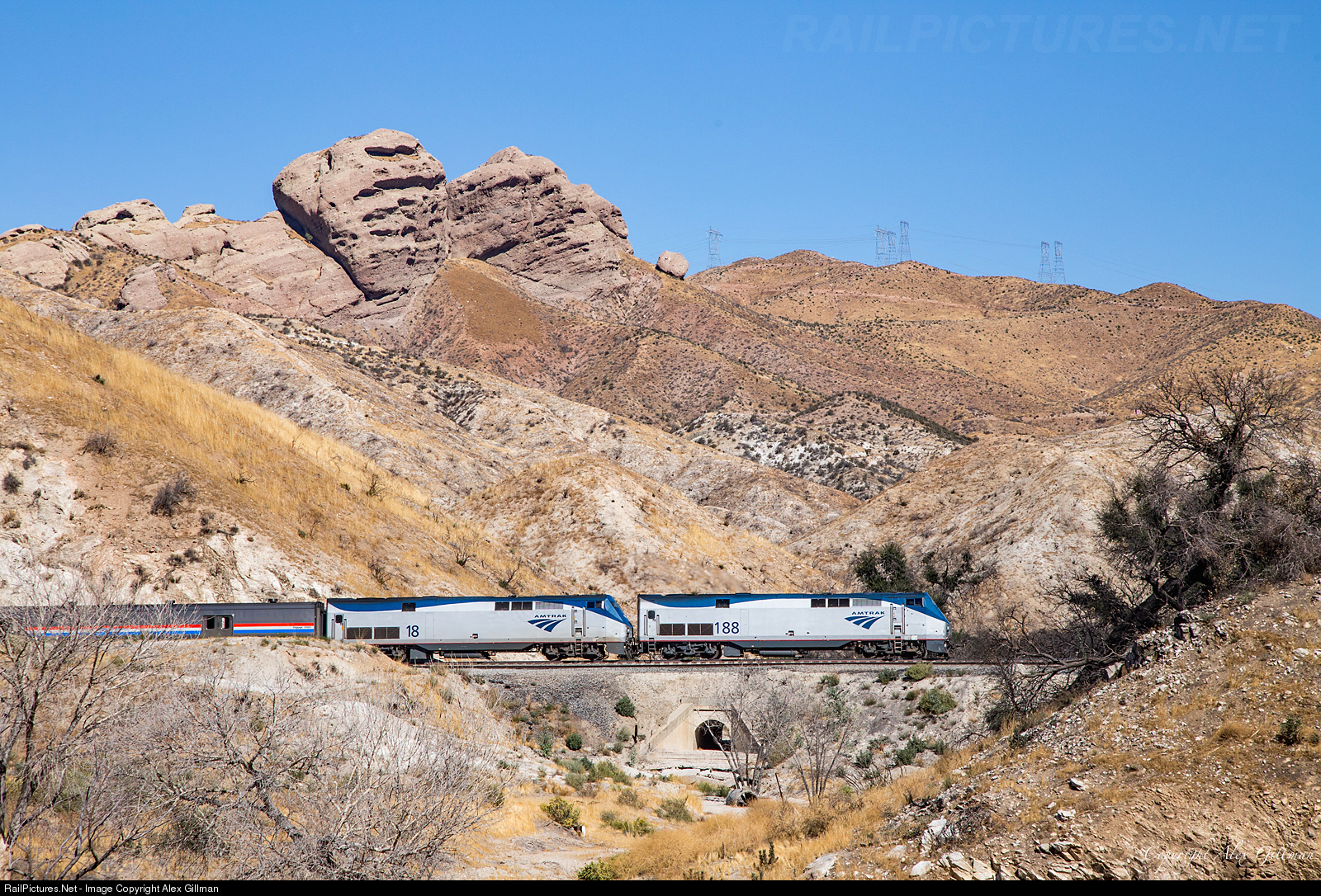 | It's a hot day in the depths of Soledad Canyon as Amtrak 14, the detouring northbound Coast Starlight, passes the iconic rock formations near Ravenna as it works upgrade toward Acton where the grade will finally crest and deposit the train in the Mojave desert. |
