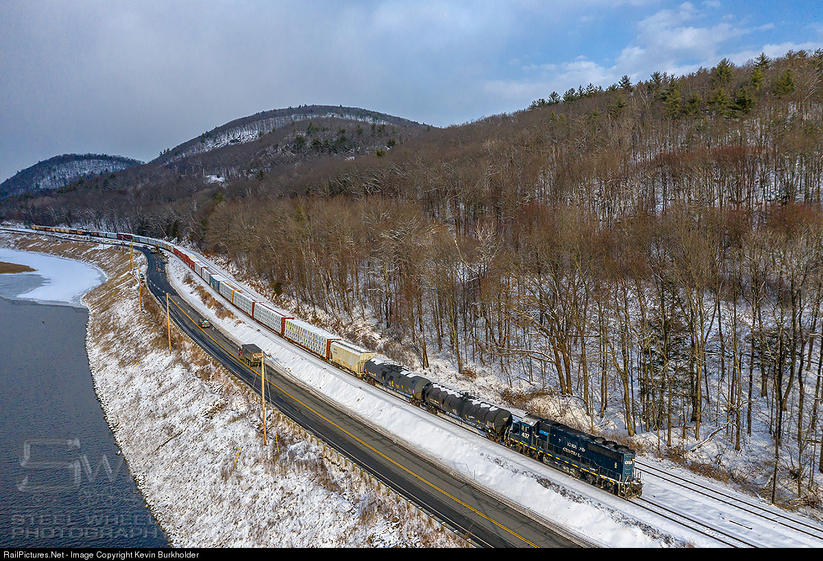 New England Central has been recovering following the CN strike and to facilitate crew shortages, some extra trains have made cameo appearances. On December 18, NECR GP40-2 437 takes 39 cars from White River Jct, VT along the Connecticut River and Route 12 at North Walpole, NH.