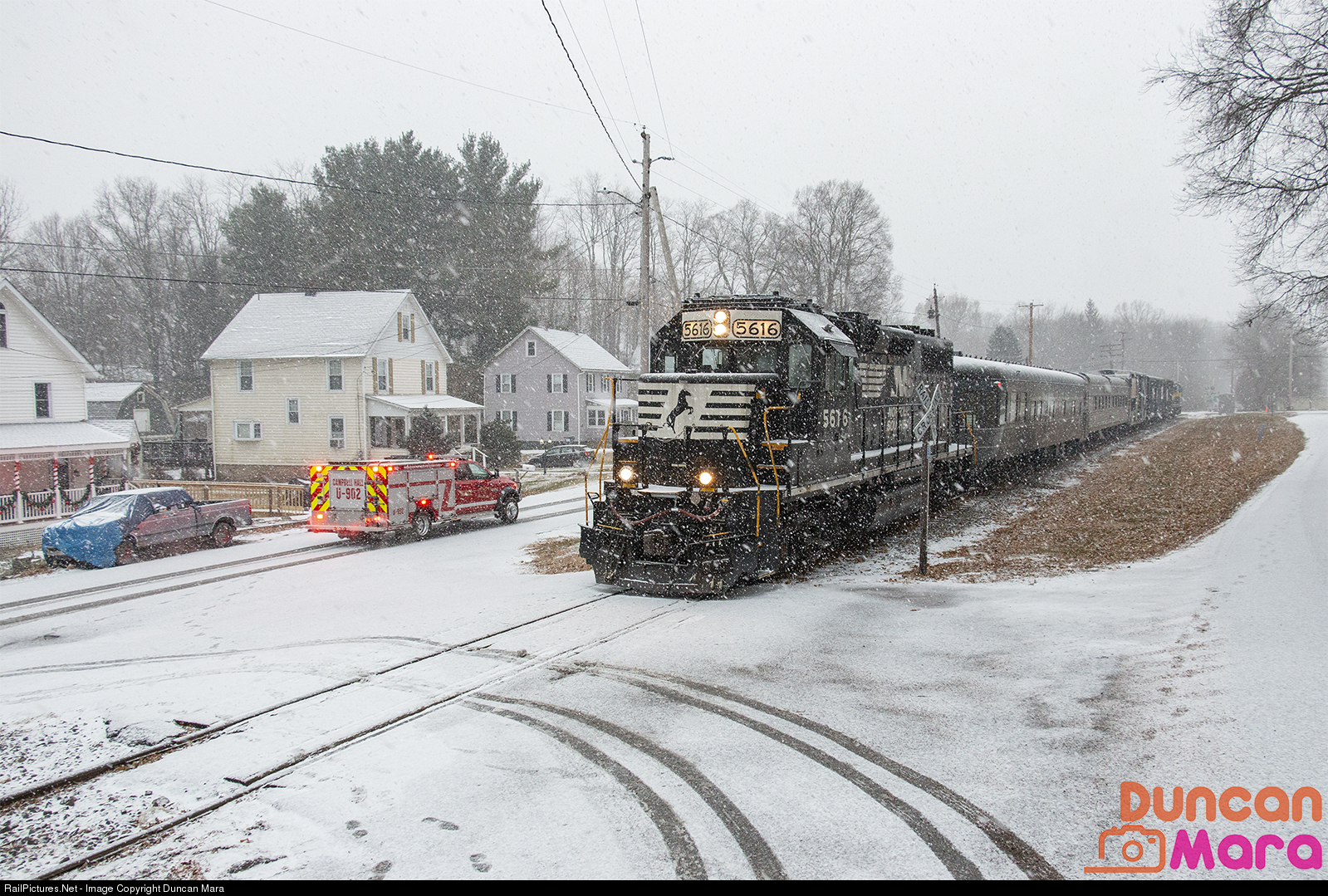 | After running to Middletown over NJ Transit, M&NJ CH-1 makes a rather early arrival at its next stop of Campbell Hall, allowing a well deserved rest for the train crew and Operation Toy Train volunteers. Snow is beginning to fall rather quickly as a Campbell Hall Fire vehicle drives past towards the toy collection point. |